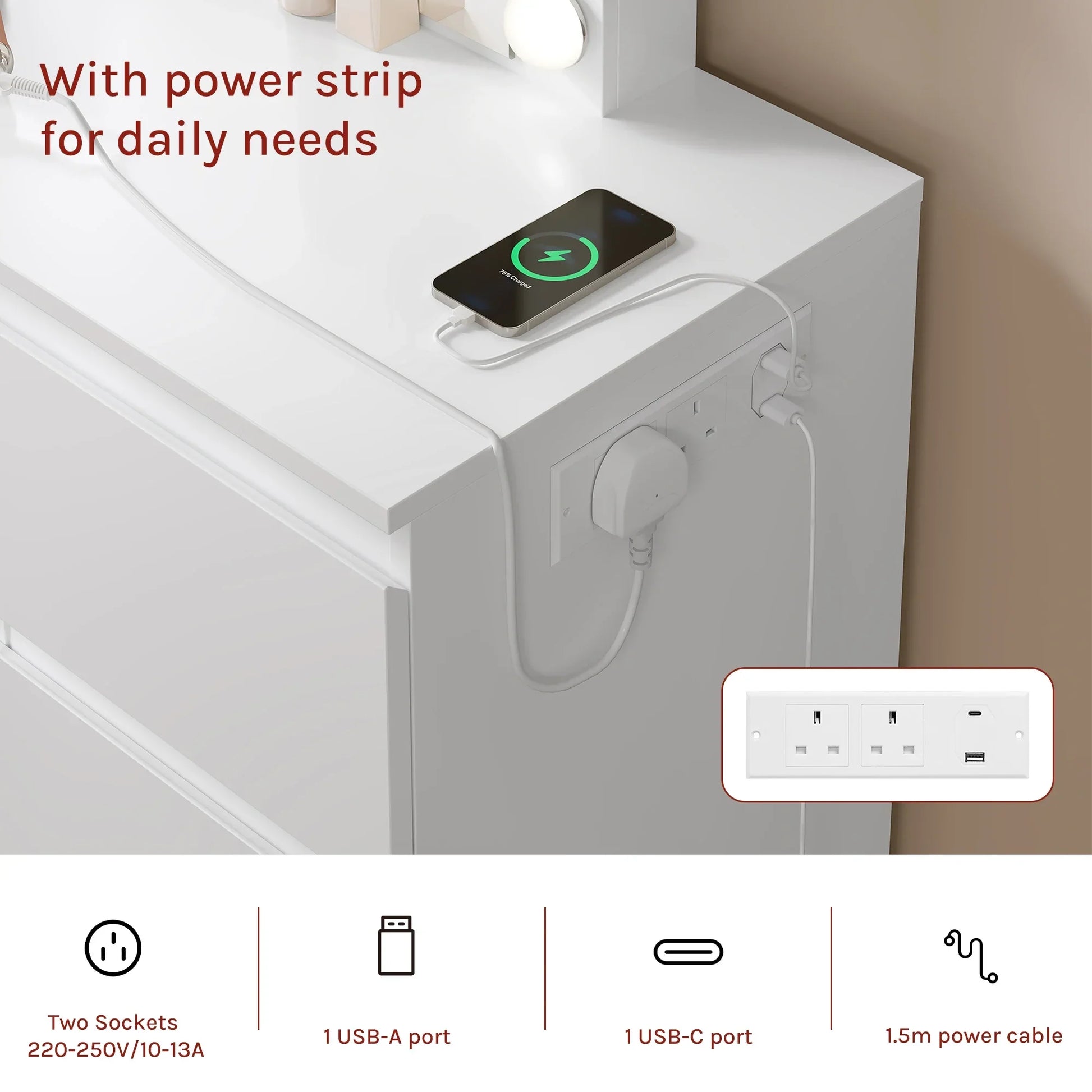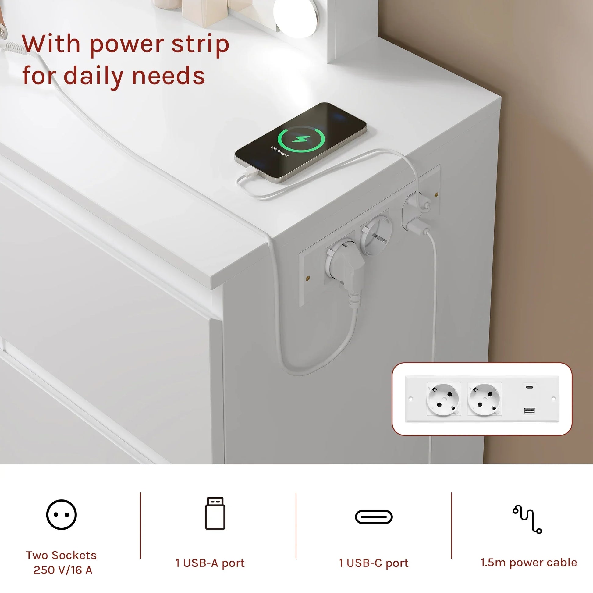 Alliez style moderne, fonctionnalité avancée et organisation optimale avec cette coiffeuse équipée d’un grand miroir LED dimmable et de prises intégrées. Conçue pour répondre aux besoins des passionnés de maquillage et de soin, elle propose une large surface de travail et 7 tiroirs de rangement discrets pour une chambre toujours ordonnée.